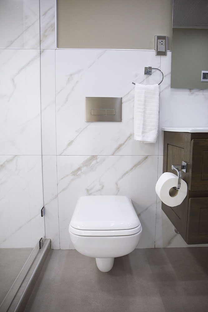 Para administrar mejor el espacio del baño, una buena opción es usar un inodoro suspendido, eliminando obstáculos y ruido visual, generando un ambiente más amplio.